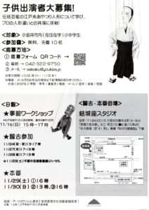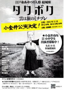 昨年10月は、渡辺えりさん 演出の「星の王子様」小金井公演では、小金井市内の小学生が、出演し、宮地楽器ホールの大ホールのステージで、「糸あやつり人形を自分の手で動かし、人形に命が宿ったようだ。」と拍手喝采を浴びました。